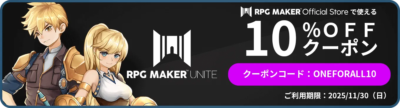 現在、「RPG MAKER Official Store」で使える「RPG MAKER UNITE」を10%引きでご購入いただけるクーポンコード(セール併用可)を2025年11月30日まで配布中ですので、お見逃しなく!