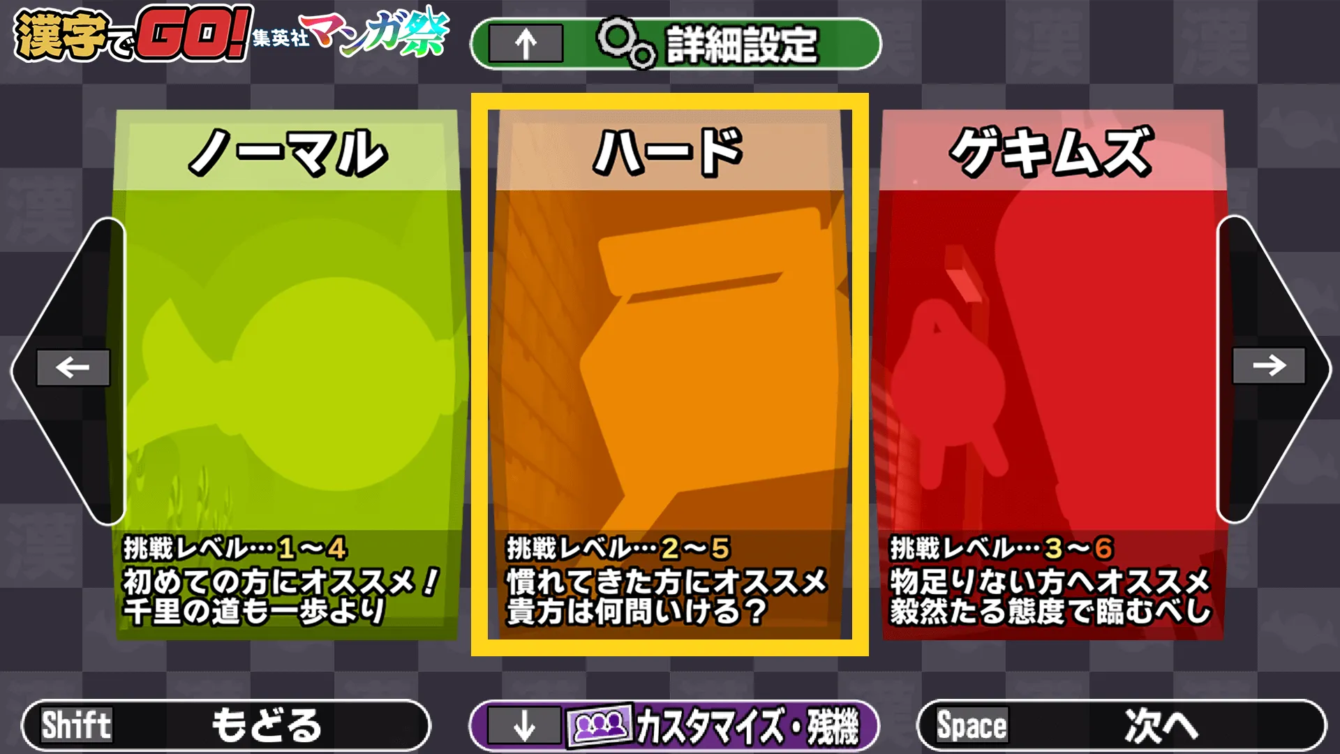 難易度は「ノーマル」「ハード」「ゲキムズ」「ヘル」から選択できます。また、「詳細設定」や「カスタマイズ・残機」で、ゲーム設定の変更が行えます。