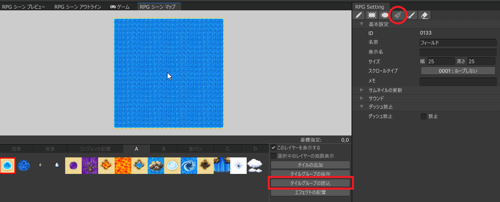 最初にタブAを選択し、「タイルグループの読込」で「World_A1」を読み込みます。