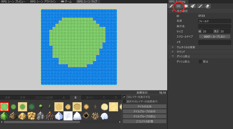 読み込まれたタイルグループの一番左上が海になりますので、マップ全体をこれで塗りつぶします。