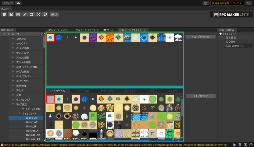 つまり、前回は全て、あらかじめ用意されていたタイルグループを使って、マップを作りました。