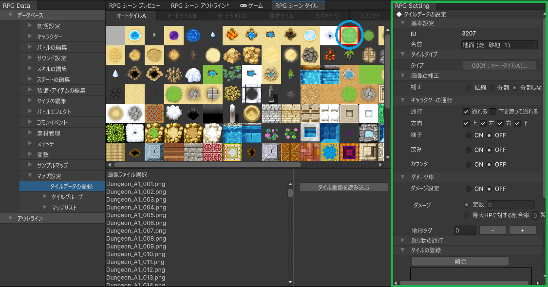 ここでは、青い円で囲まれたタイルが選択中で、緑枠で囲まれたインスペクタに、そのタイルの設定が表示されています。