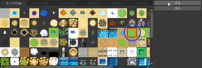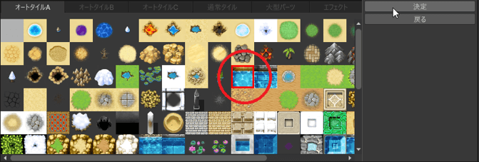 ここから、このマップに使いたいタイルが追加可能です。ここではオートタイルAの水路を選択します。