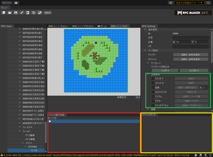 イベント実行内容(赤枠の部分)と、イベントコマンド(黄色枠の部分)というウィンドウが新たに表示されます。