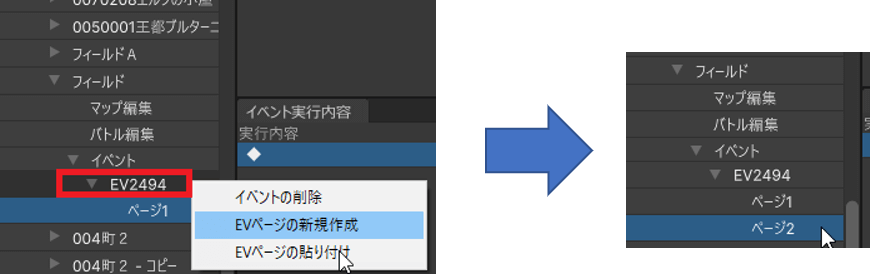 ヒエラルキーのマップリスト>(マップ名)>イベント を右クリックし、「EVページの新規作成」を選択します。