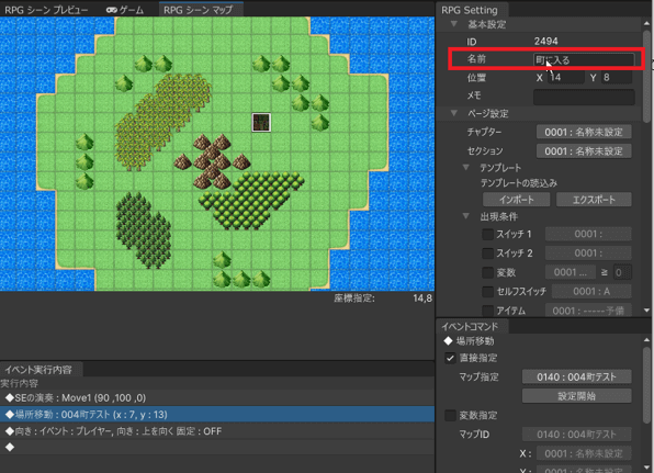 それでは仕上げに、このイベントに名前を付けましょう(赤枠の部分)。ここでは「町に入る」にしました。