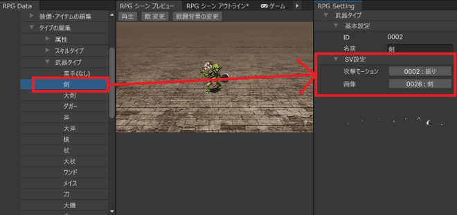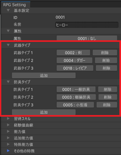 ここで武器タイプに剣を追加すれば、その職業のアクターは剣タイプの武器が装備可能になります。