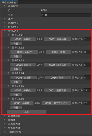 スキルには魔法や必殺技がありますが、該当のアクターがそのスキルを習得するレベルを設定します。