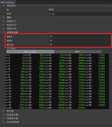 値を設定すれば、レベル毎の成長曲線を、グラフとして見ることが可能になります。
