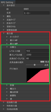例えば、攻撃力の設定の際の項目を、図の緑色の枠で囲んであります。