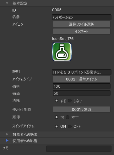 アイテムは 装備・アイテムの編集>アイテム にて設定されます。