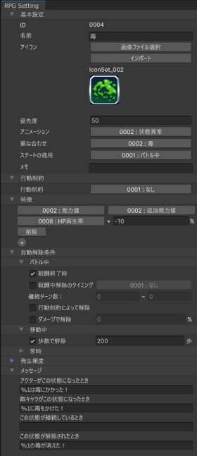 ステートでは、前述の「特徴」が設定可能で、「毒(一定時間ごとにダメージ)」「沈黙(魔法使用不可)」などは、特徴での設定になります。