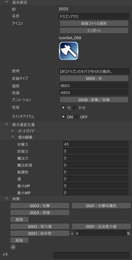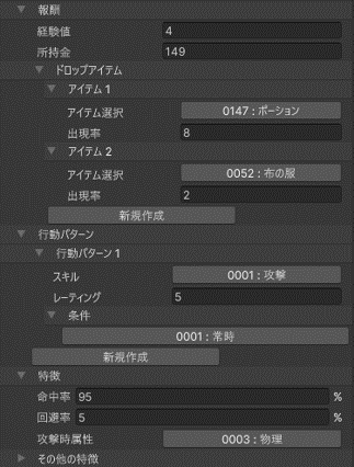 前述の通り、命中率、回避率、攻撃時属性は、設定必須です。また、「その他の特徴」も、必要に応じて設定してください。