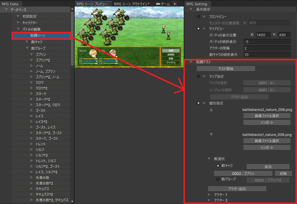 戦闘テストのためには、戦うべき敵グループを設定した後、参加するアクターを設定する必要があります。