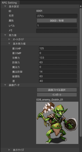 名前は、一番上の「基本設定」で、見た目は「画像データ」で画像ファイルを読み込んで設定します。