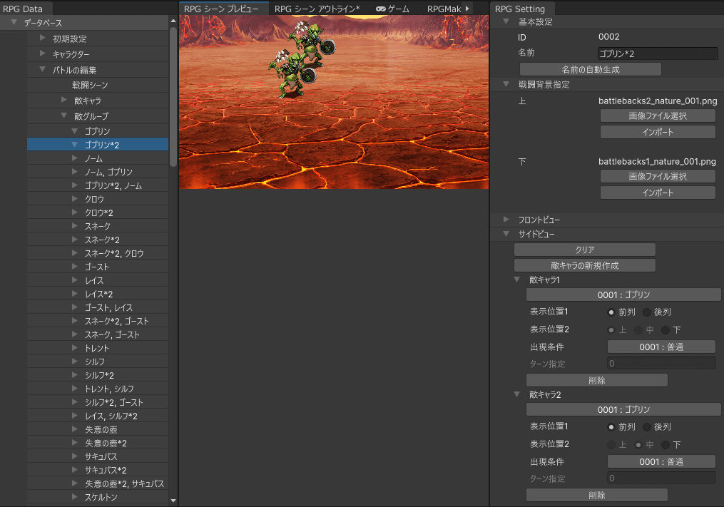 まず、戦闘で戦うことになる敵キャラの設定を行い、その後必要に応じて、敵グループの設定を行います。