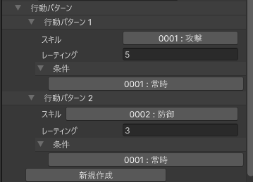 「行動パターン」にて設定します。通常攻撃や、使用するスキルを複数設定可能で、 可能な行動の中から、条件に応じてランダムに選ばれます。