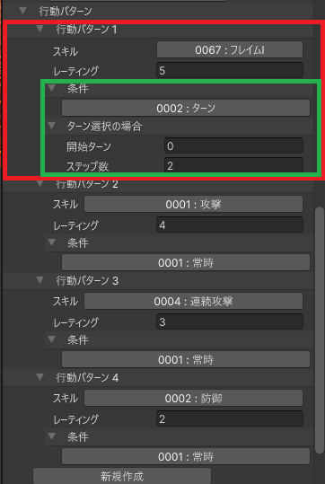 行動パターン1の「フレイムI」のみ、行動条件が「ターン」、「ステップ数2」となっています。