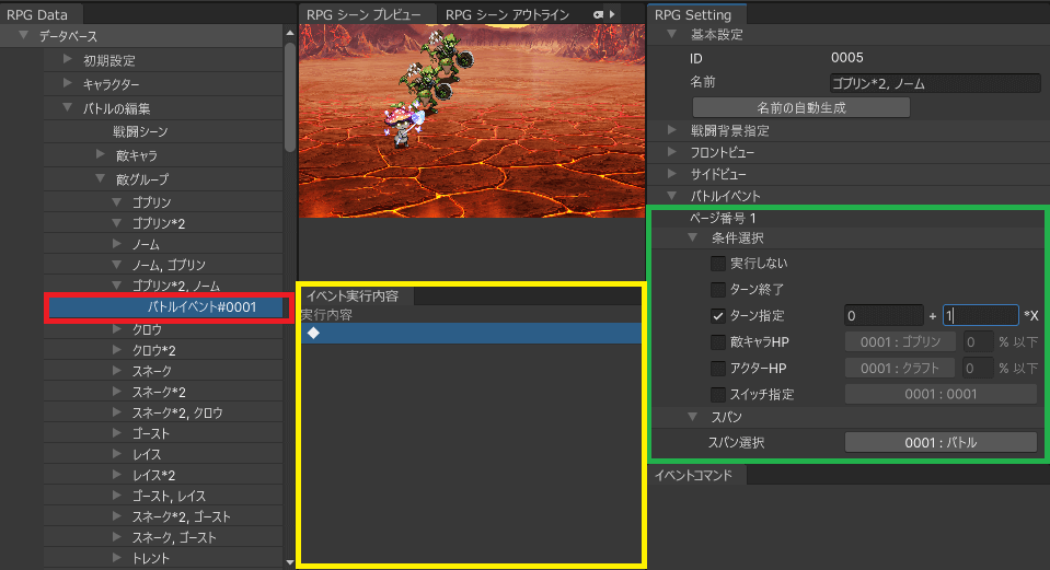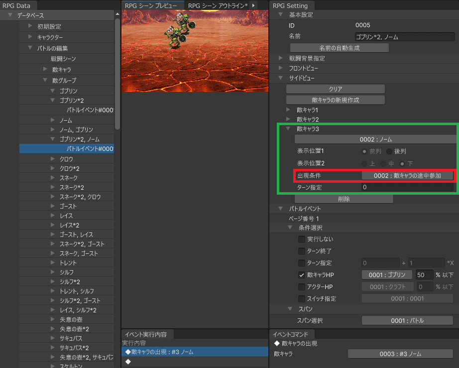 ここでは例として、「ゴブリン1のHPが最大値の50%以下になった時」に、そのバトルイベントを起動させています。