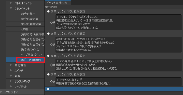 このアイテムを追加するイベントを作り、パーティがこの本を手に入れたら、メニュー画面で使用し、文章が表示されることを確認してください。