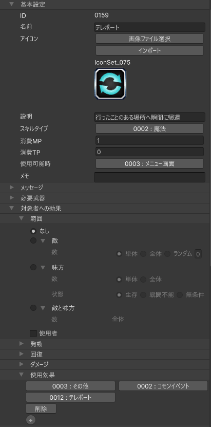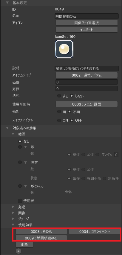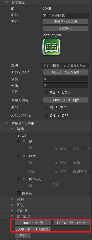 アイテム作成の時と同様に、「使用効果」にて、コモンイベントの実行を設定します。