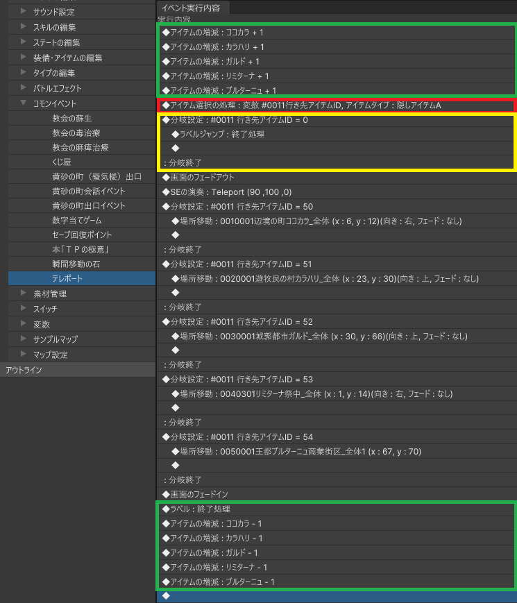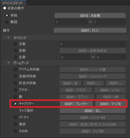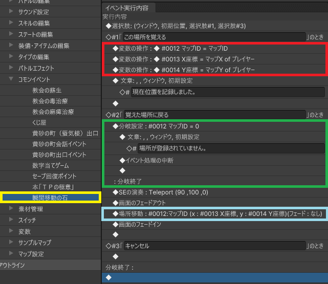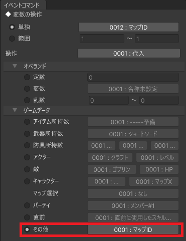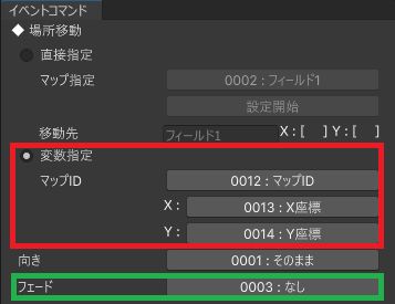 赤色の枠で囲った部分のように、変数にマップIDや座標を代入します。