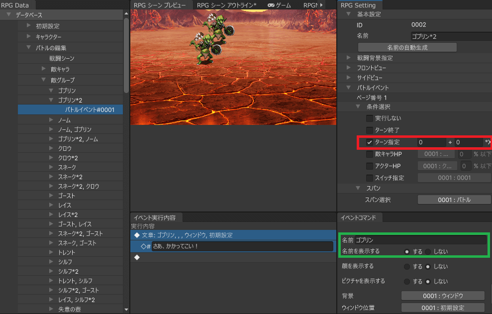 赤枠で括ったターン指定により、0ターン目が選択されます。また、緑色で括った部分で、ゴブリンという名前を表示させています。