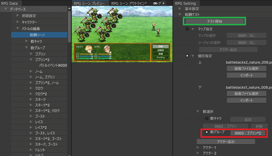試しに、前述のイベントの動作を、「戦闘テスト」にて確認しましょう。