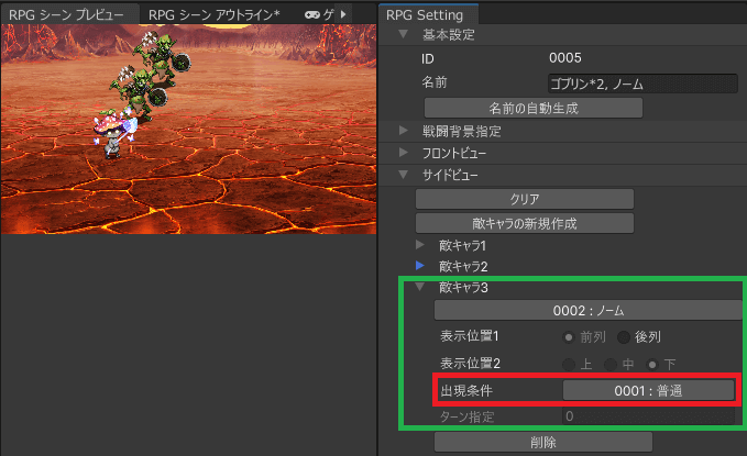 戦闘途中で参加する敵キャラの設定が可能です。敵グループのインスペクタの敵キャラ設定に出現条件 があります。