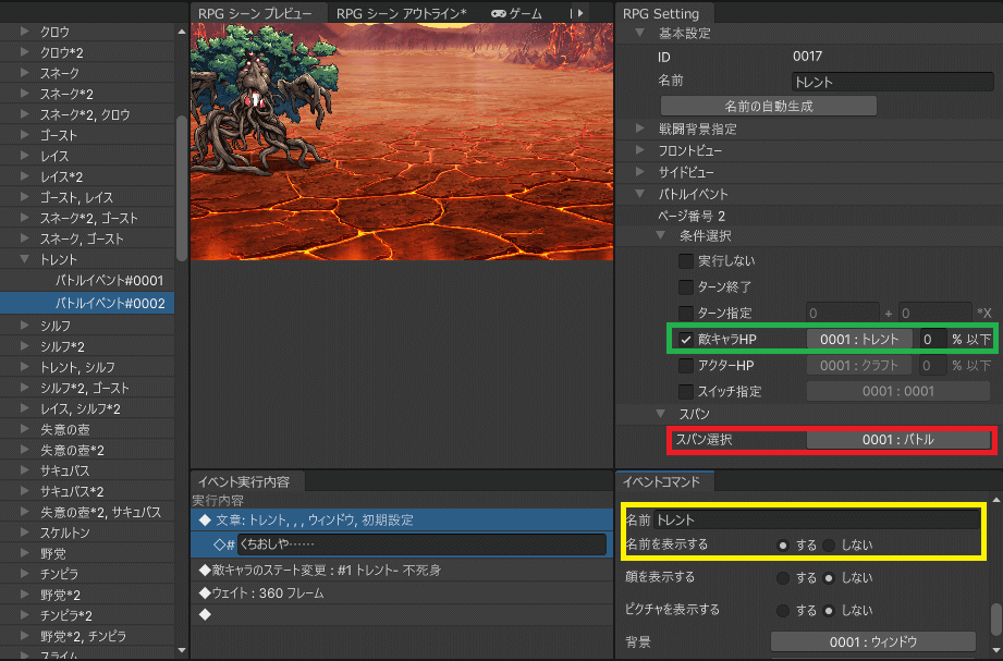 これが追加されると、インスペクタに「バトルイベント」の項目が作成されます(緑枠の部分)。