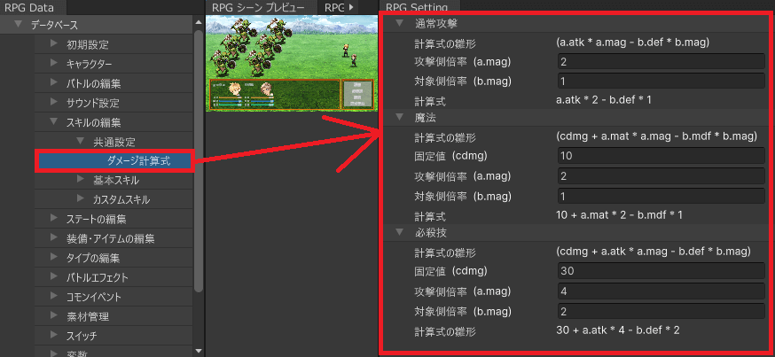 ここで「通常攻撃」「魔法」「必殺技」の基本ダメージ計算式の基礎を入力します。