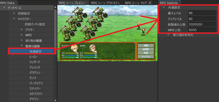 「ダメージ計算式」と、「経験値およびレベルの共通設定」を行うと、オートガイドが使用可能になります。
