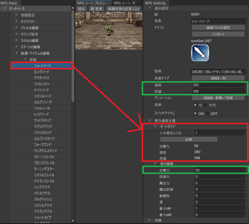 自動入力される項目は、価格、売価、攻撃力(武器)、防御力(防具)です。