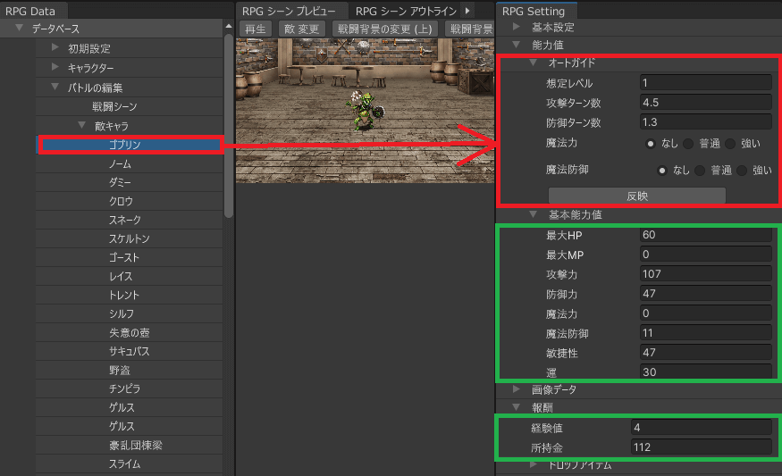 その敵キャラと戦う時のアクターの想定レベルを設定すると、最大HPや攻撃力などのパラメータ、および獲得経験値と所持金を自動設定してくれます。