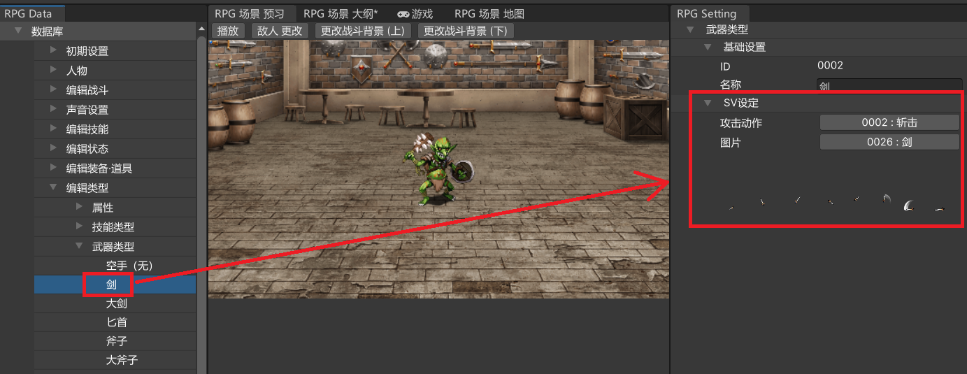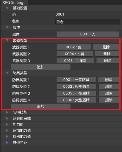 此处,在武器类型中追加剑,该职业的角色就可以装备剑类型的武器。