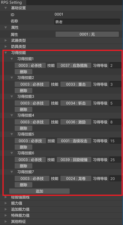技能包括魔法和必杀技,可以设置该角色可以学会该技能的等级。