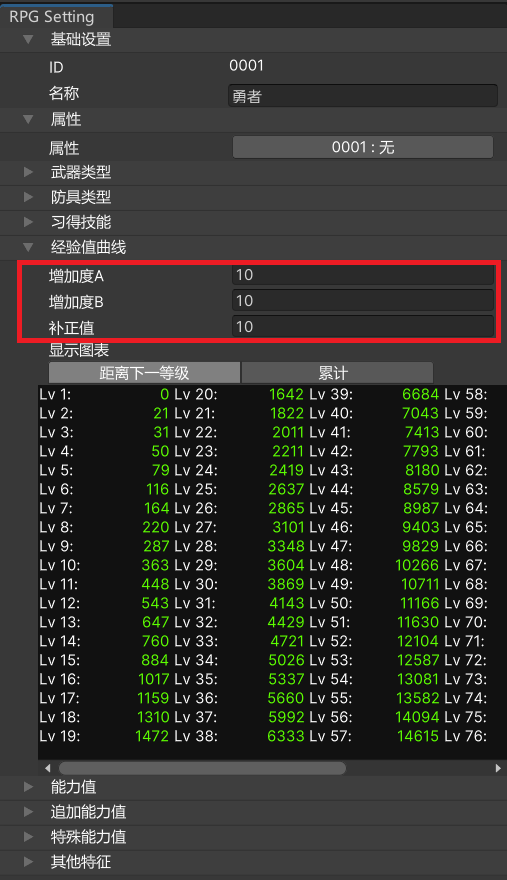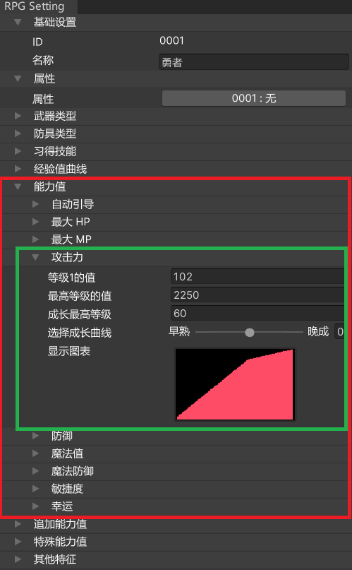 设定数值后,可以通过图表方式确认每个等级的成长曲线。