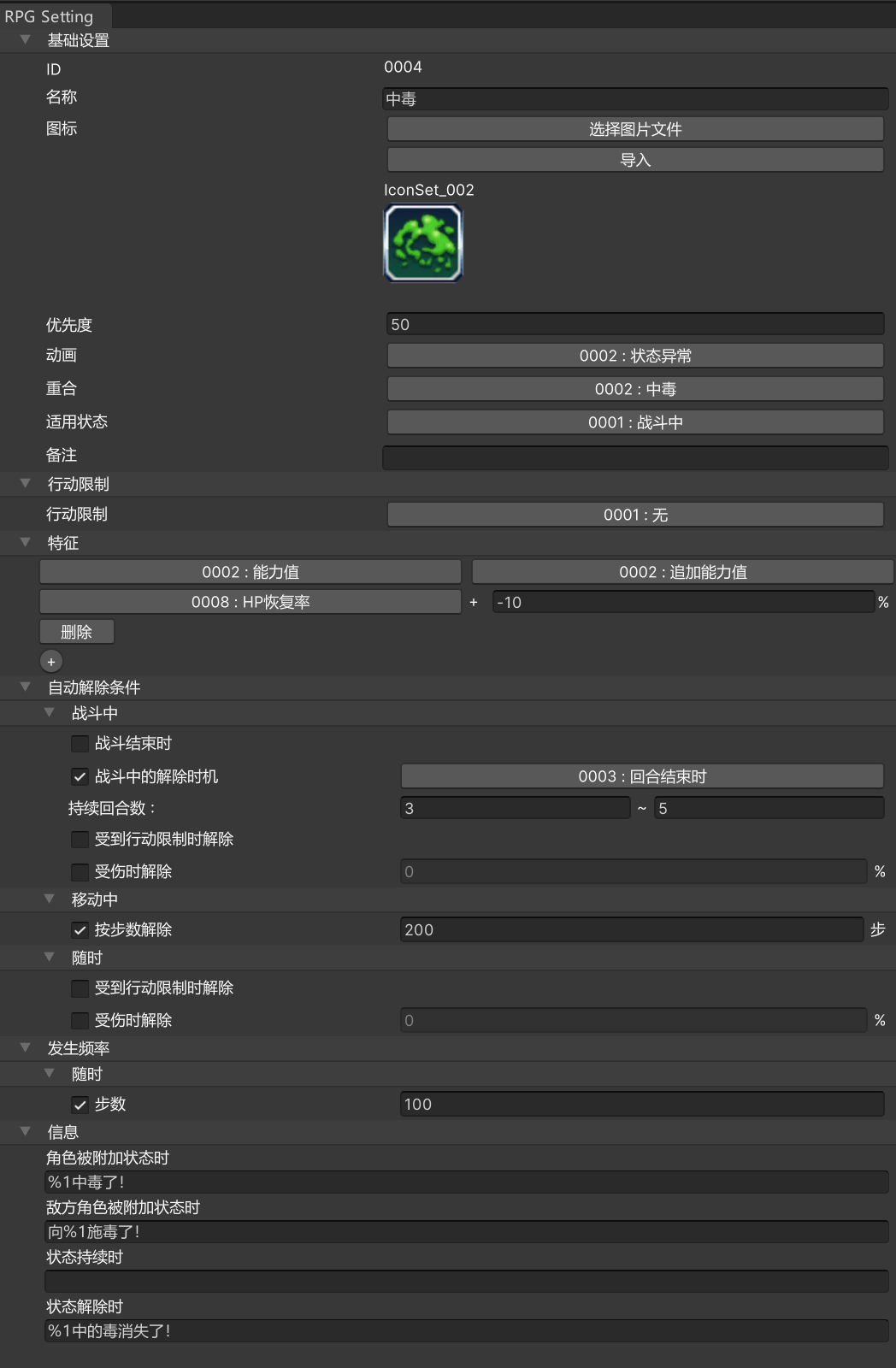 在状态中可设置上述的“特性”,“中毒(每隔一定时间造成伤害)”“沉默(不可使用魔法)”等通过特性来设置。