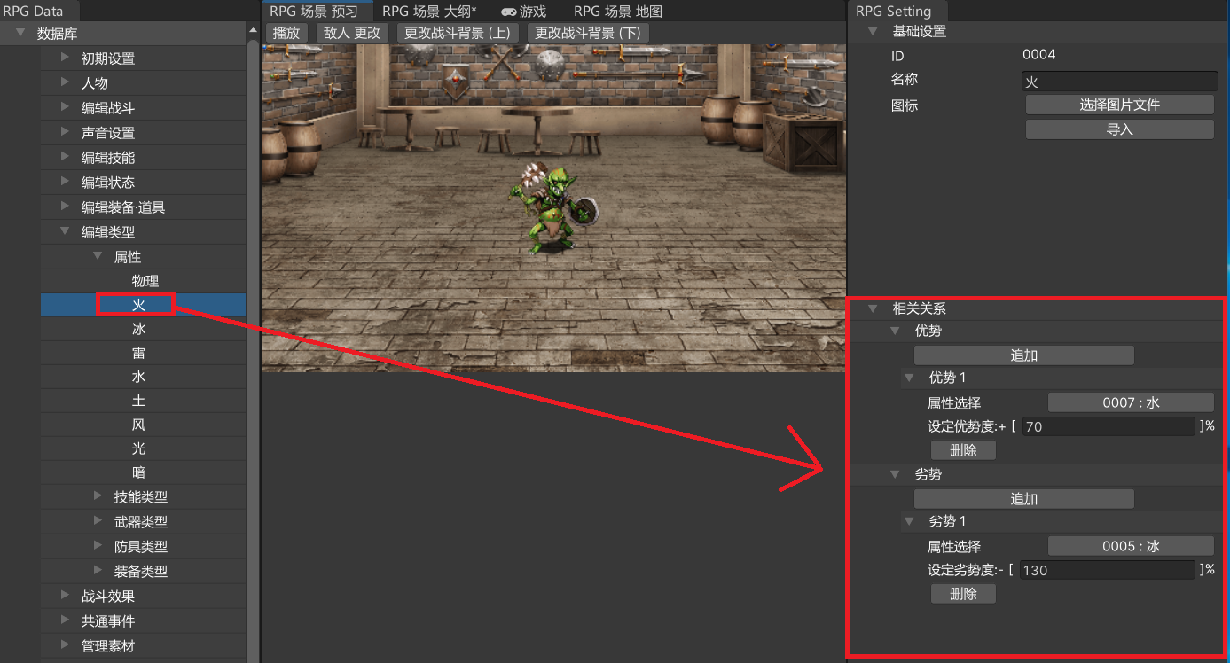 在RPG Setting的“相互关系”中可以设置“优势”与“劣势”。