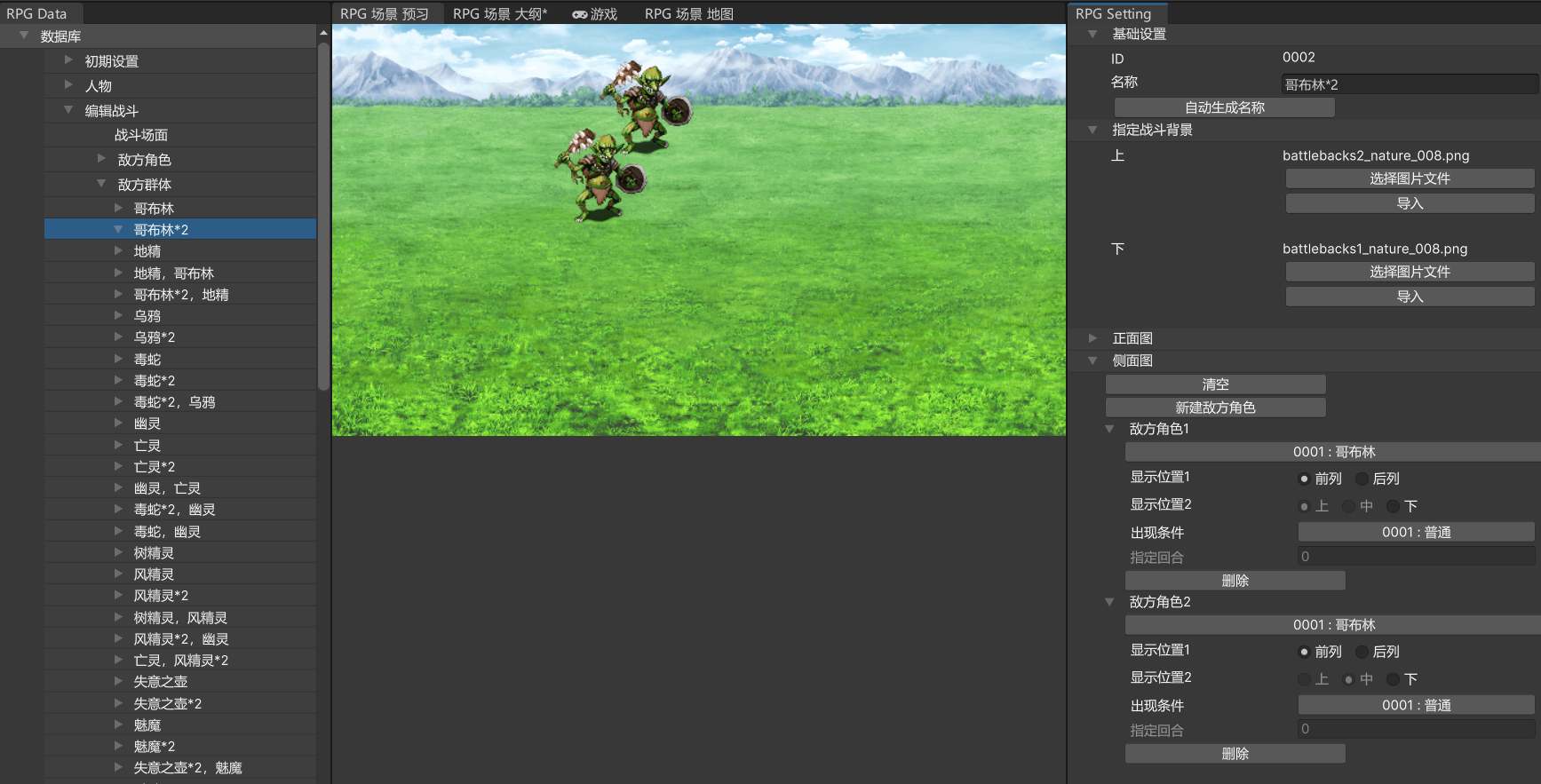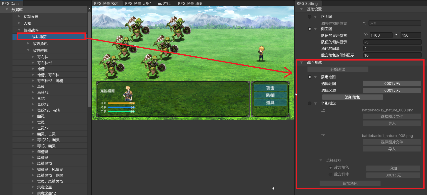 战斗测试可通过RPG Data的A战斗场景>战斗测试 的RPG Setting“战斗测试”来实现。