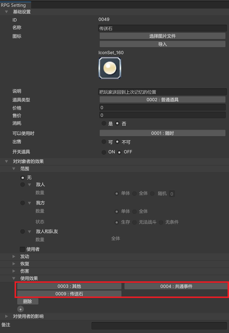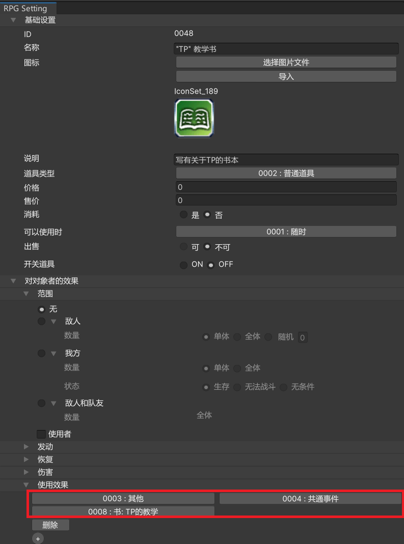 与制作物品时相同,通过“使用效果”,设置共通事件的执行。
