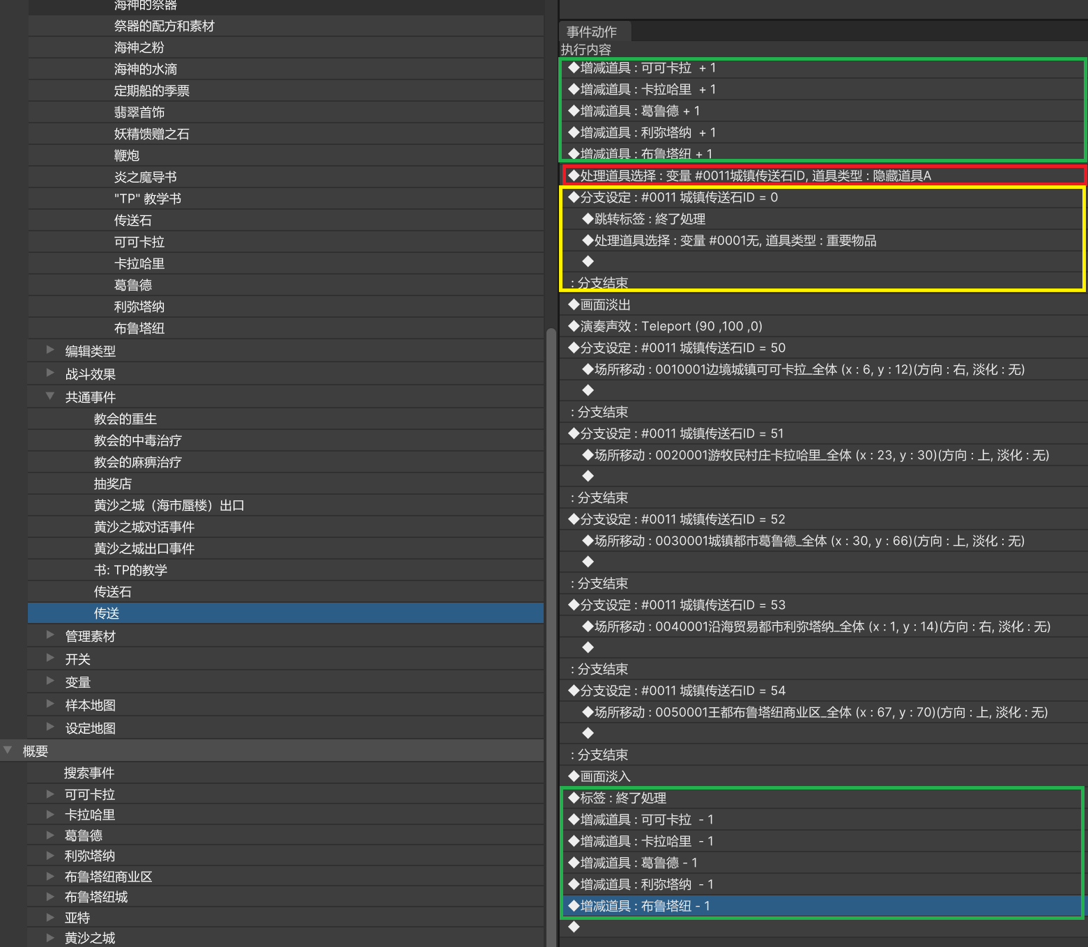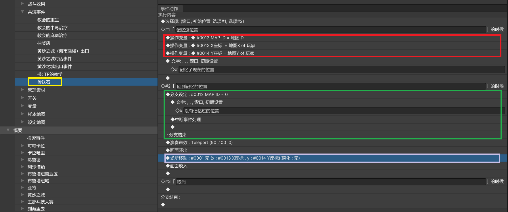 并且在项目视图部分,显示事件执行内容的设置窗口(黄框部分)。