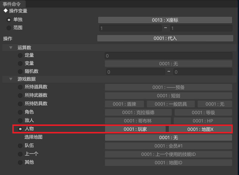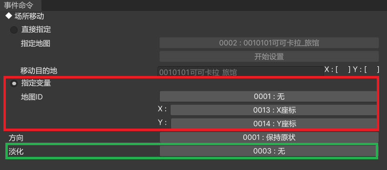 通过人物>移动>场所移动 ,将目标移动地点设置为“指定变量”。图中的青色框出部分。