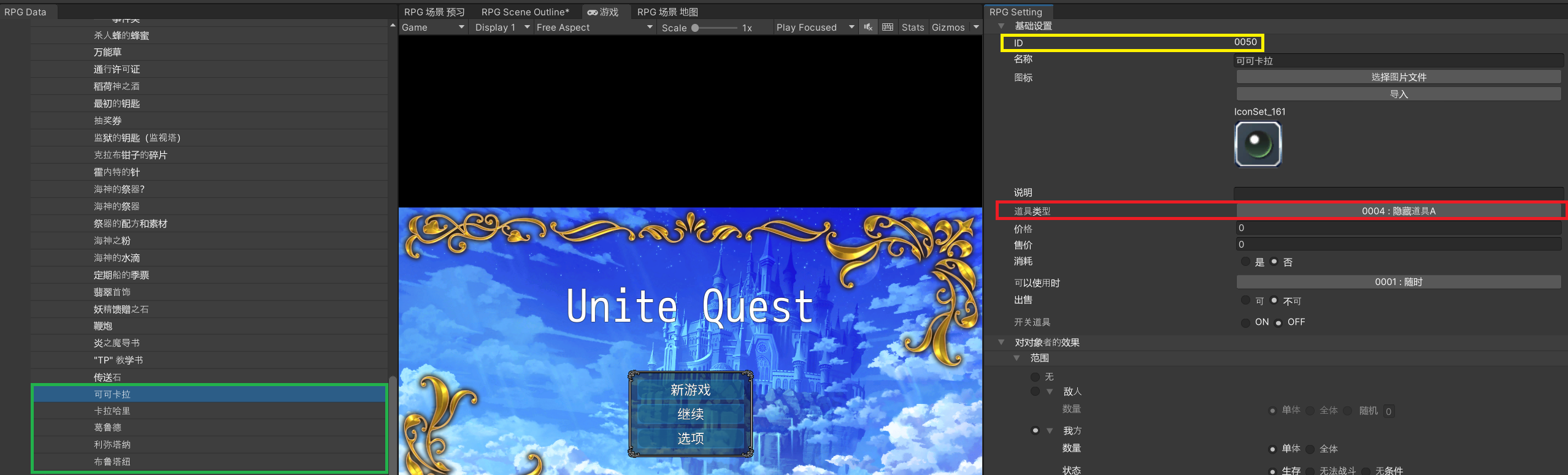 在RPG Data的设置装备・物品>物品 中添加物品类型为“隐藏物品A”,名称为目标移动地点的物品。