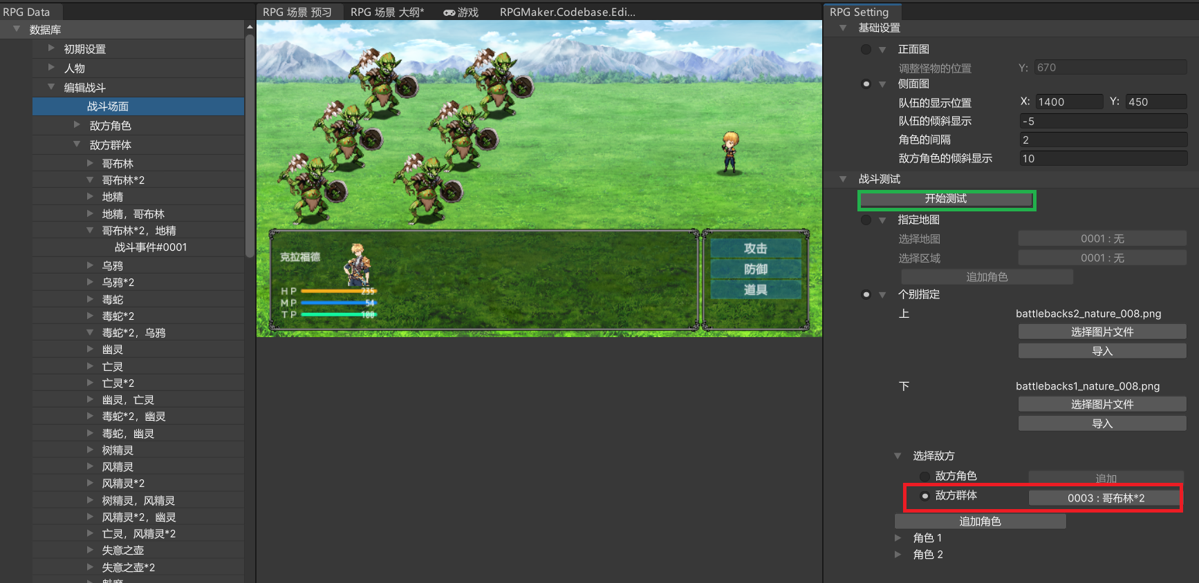 如RPG Setting中的战斗测试>个别指定>选择敌人 中红框部分所示,勾选敌群 ,