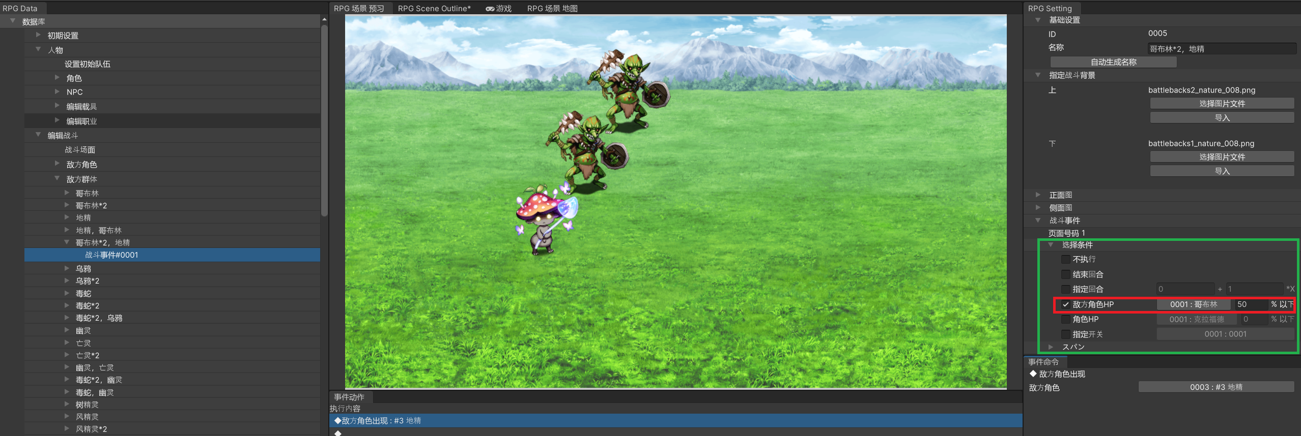 此处作为示例,设置“当哥布林1的HP低于最高值的50%时”,启动该战斗事件。