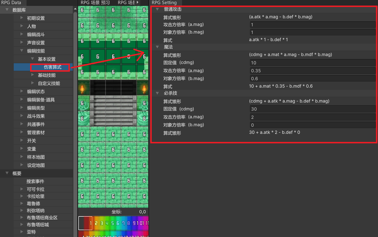 此外,还会设置固定值(cdmg)、攻击方倍率(a.mag)、目标方倍率(b.mag),伤害计算公式将发生变化。